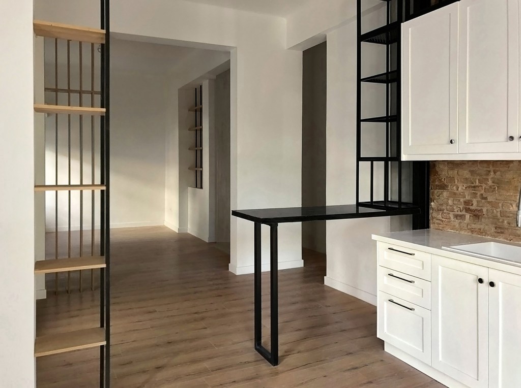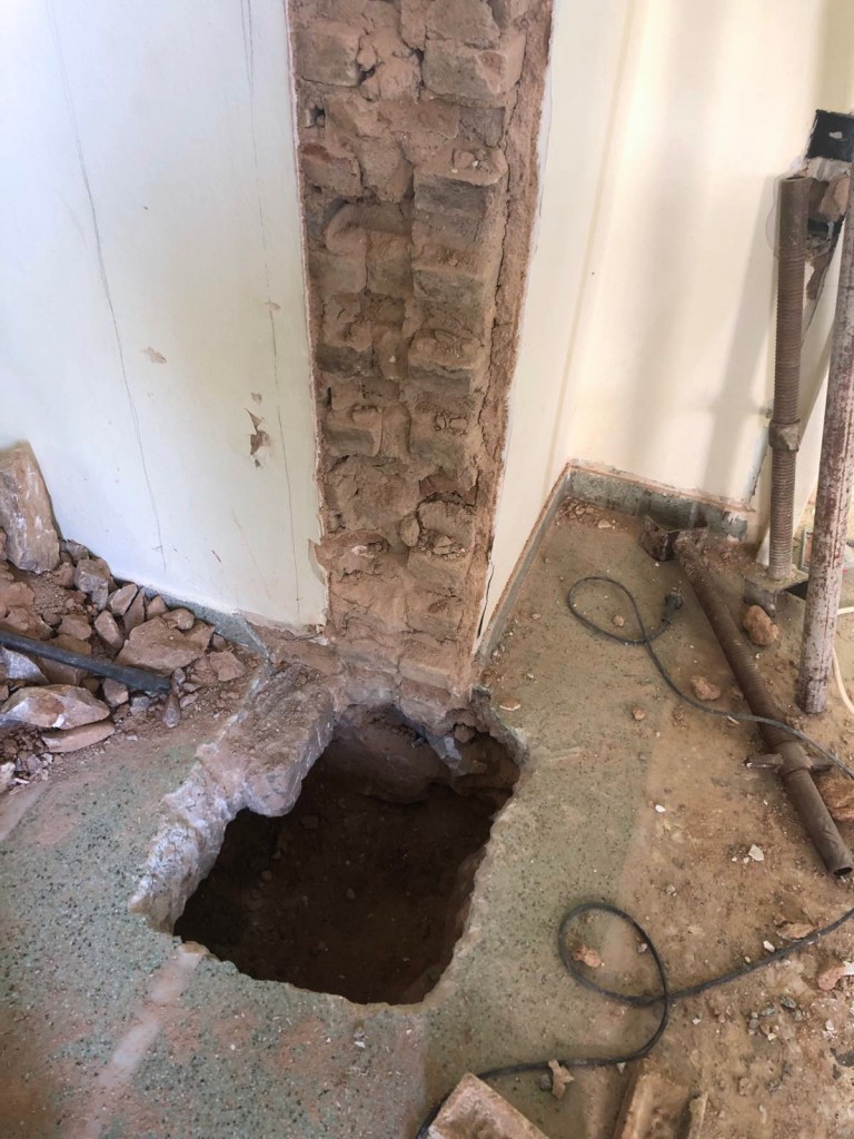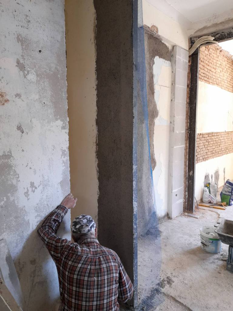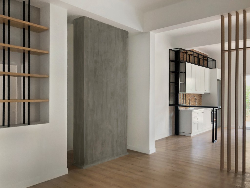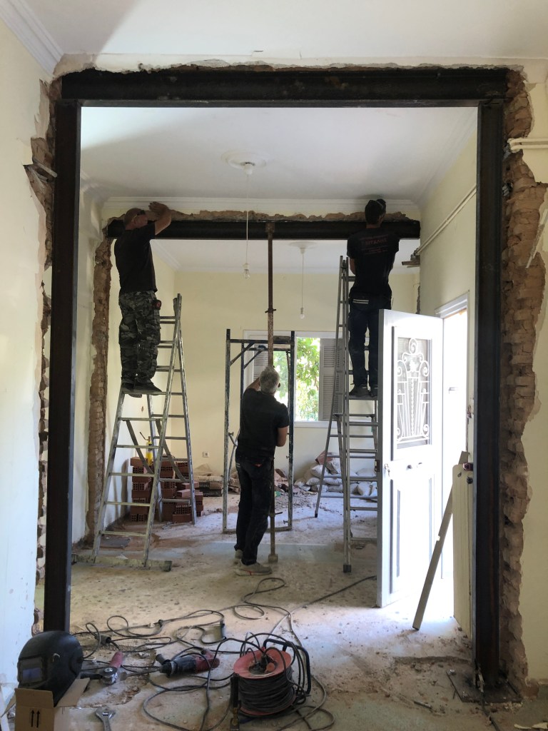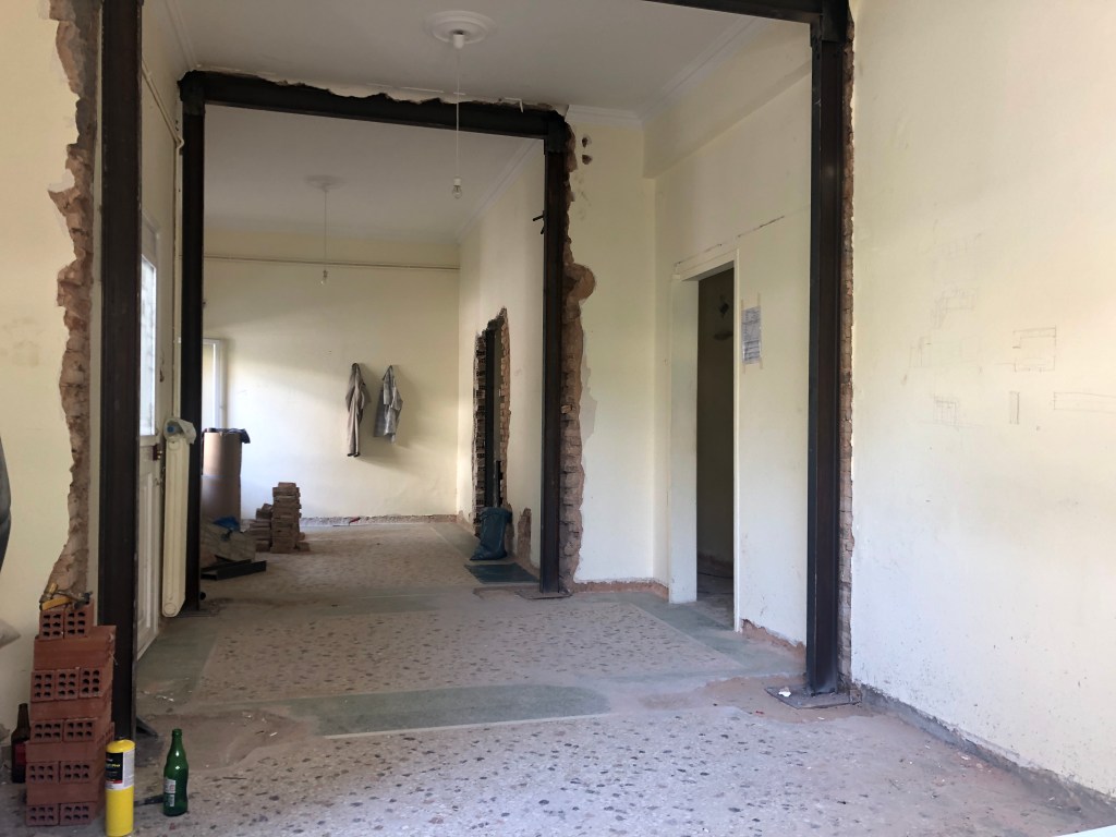 Η διαδικασία της ανακαίνισης δεν είναι απλή. Από την αισθητική ιδέα μέχρι την ολοκλήρωση των εργασιών μεσολαβούν οι τεχνικές μελέτες, το γκρέμισμα, η υποστύλωση (όπου απαιτείται) και η σωστή τοποθέτηση των νέων υλικών από έμπειρους τεχνίτες. Η δε επικοινωνία του εργολάβου που επιβλέπει τις εργασίες με τους ανθρώπους που ζουν πάνω, κάτω, δεξιά ή αριστερά του χώρου που αναβαθμίζεται είναι ίσως το κλειδί στην ταχεία ολοκλήρωση της ανακαίνισης και στη διατήρηση της καλής γειτνίασης. Παρακάτω φαίνεται ένα παλιό χωλ-σαλόνι-δωμάτιο – πως γκρεμίστηκε στους διαχωριστικούς τοίχους και πως ολοκληρώθηκε η διαδικασία υποστύλωσης με νέες βάσεις μέσα στο έδαφος για να πατήσουν οι κοιλοδοκοί που στήριξαν τα πανωσηκώματα. Η δύο τελευταίες φώτος δείχνουν το τελικό αποτέλεσμα.
